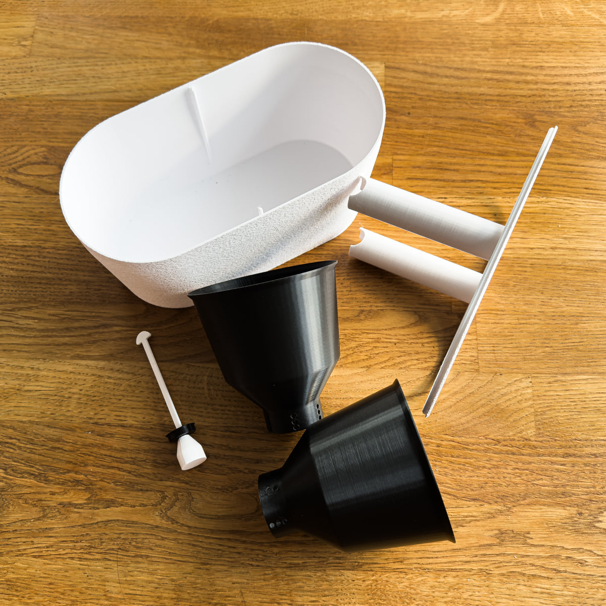 Tuote on Suomessa valmistettu myrkyttömästä, kierrätys- ja elintarvikekelpoisesta PETG-muovista 3D-tulostamalla. Valmistuksessa on käytetty ainoastaan uusiutuvalla energialla tuotettua sähköä (tuulienergia). 3D-tulostus on erittäin ympäristöystävällinen tapa valmistaa tuotteita lähellä ja vain tarpeeseen. Valmistustekniikka ei tuota juuri lainkaan jätettä.